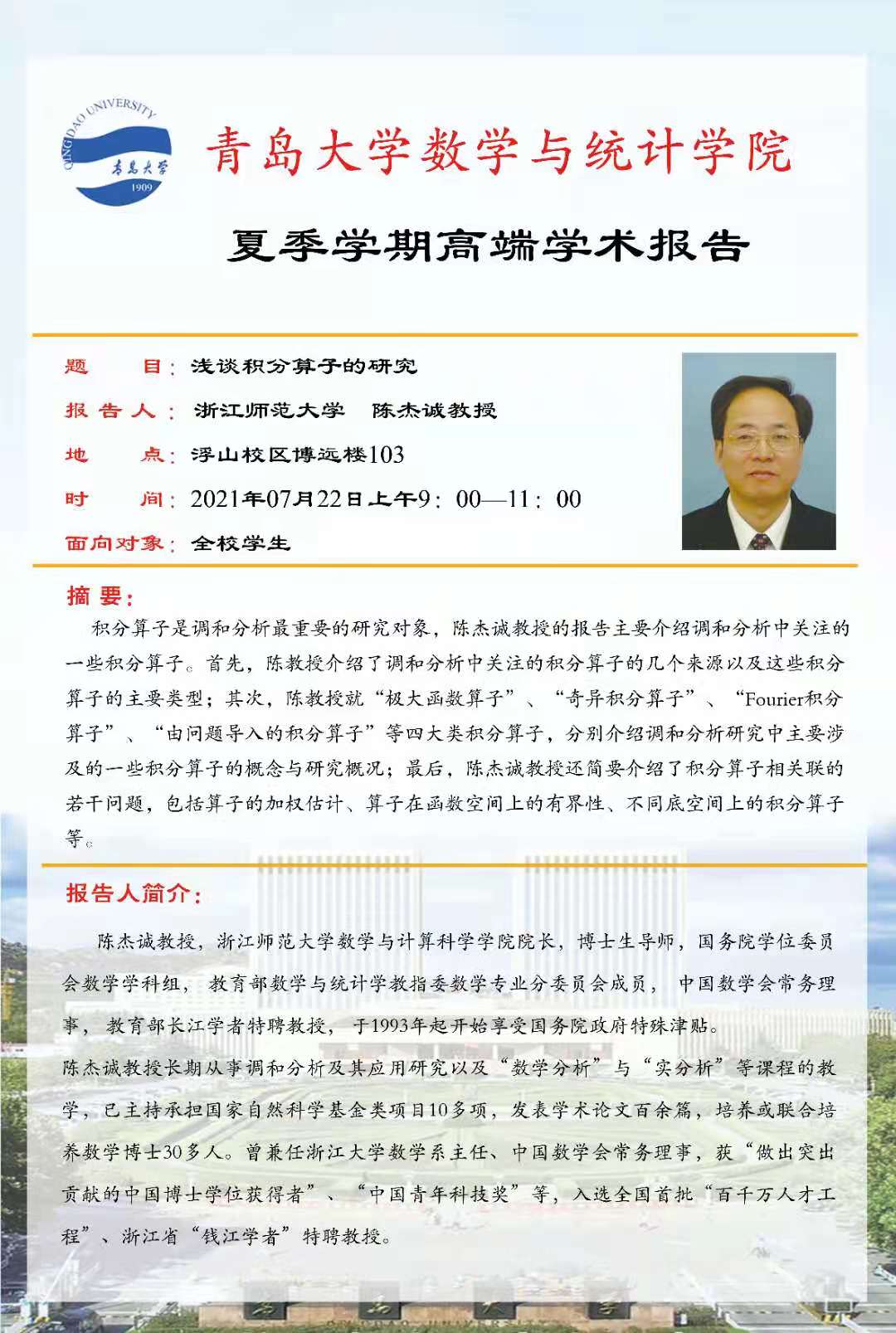 夏季学期第九场高端学术报告在国际学术交流中心崇德厅举行,来自浙江师范大学的教育部数学与统计学教指委数学专业分委员会委员陈杰诚教授为尊龙凯时国际娱乐