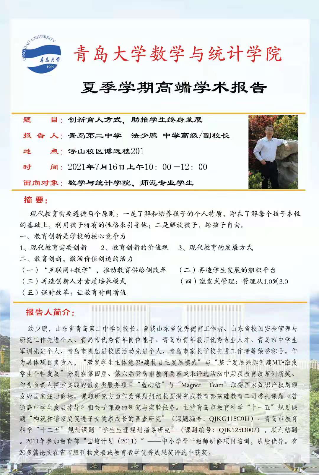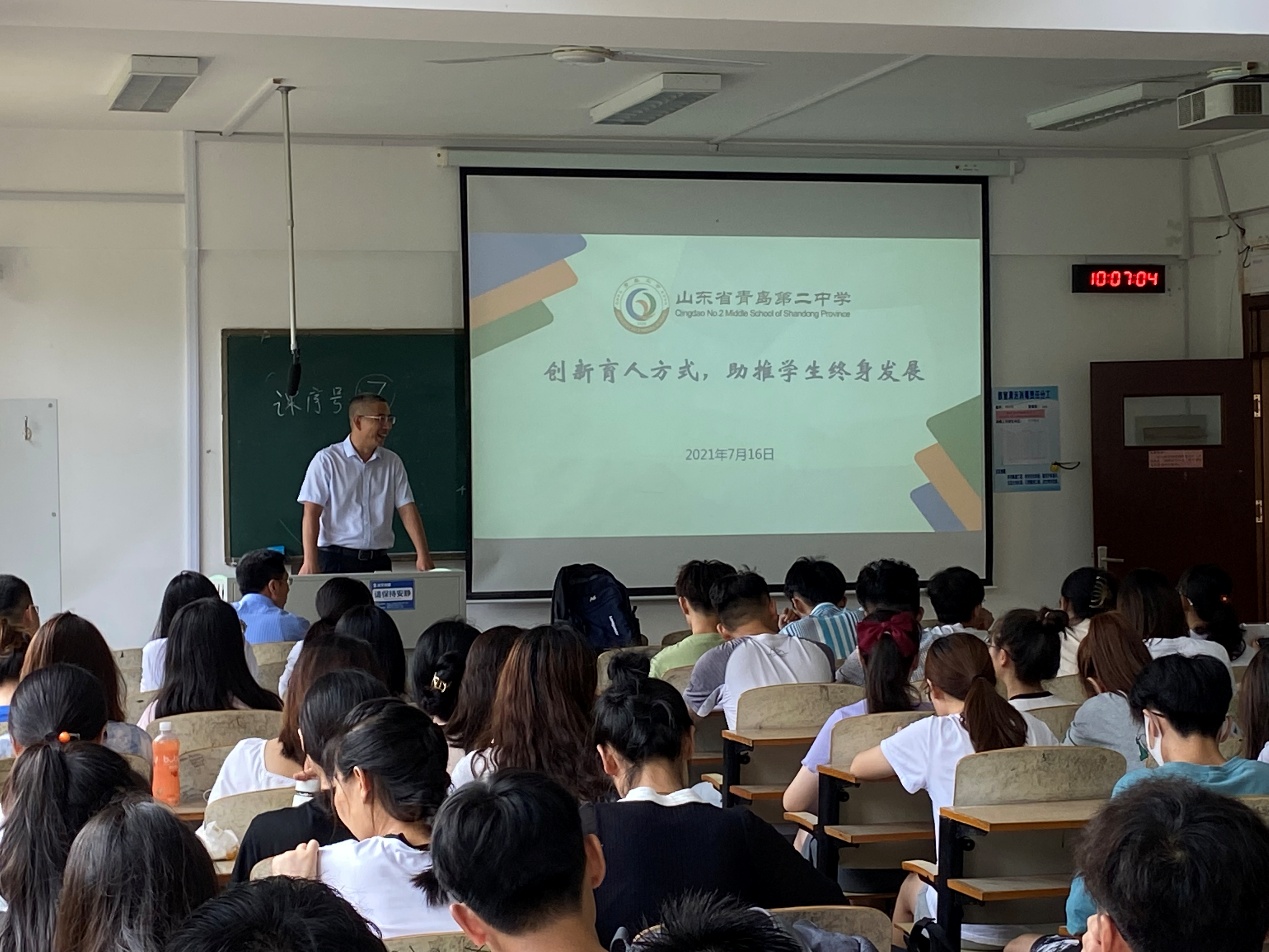 夏季学期第五场高端学术报告在博远楼204教室举行,青岛二中副校长法少鹏作了“创新育人方式,助推学生终身发展”的学术报告。