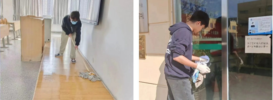 共60名学子分别在金家岭、浮山两个校区同步开展以“创建文明教室”为主题的室内志愿活动和以“创建文明校园”为主题的室外志愿活动。志愿者们分别前往浮山校区的师院操场、东西两院操场、励行楼与金家岭校区的剑湖、东西两院操场等地进行卫生打扫工作,使校园一隅变得干净明亮,为我校师生提供更优良的工作学习环境。