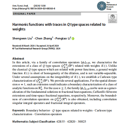 2021级数学与应用数学专业本科生刘盛文以第一作者在《Annals of Functional Analysis》上发表题为“Harmonic functions with traces in Q type spaces related to weights”的长篇研究论文,(//doi.org/10.1007/s43034-024-00363-8)。该杂志是泛函分析与调和分析领域中的SCI期刊。指导教师和通讯作者为李澎涛教授。
