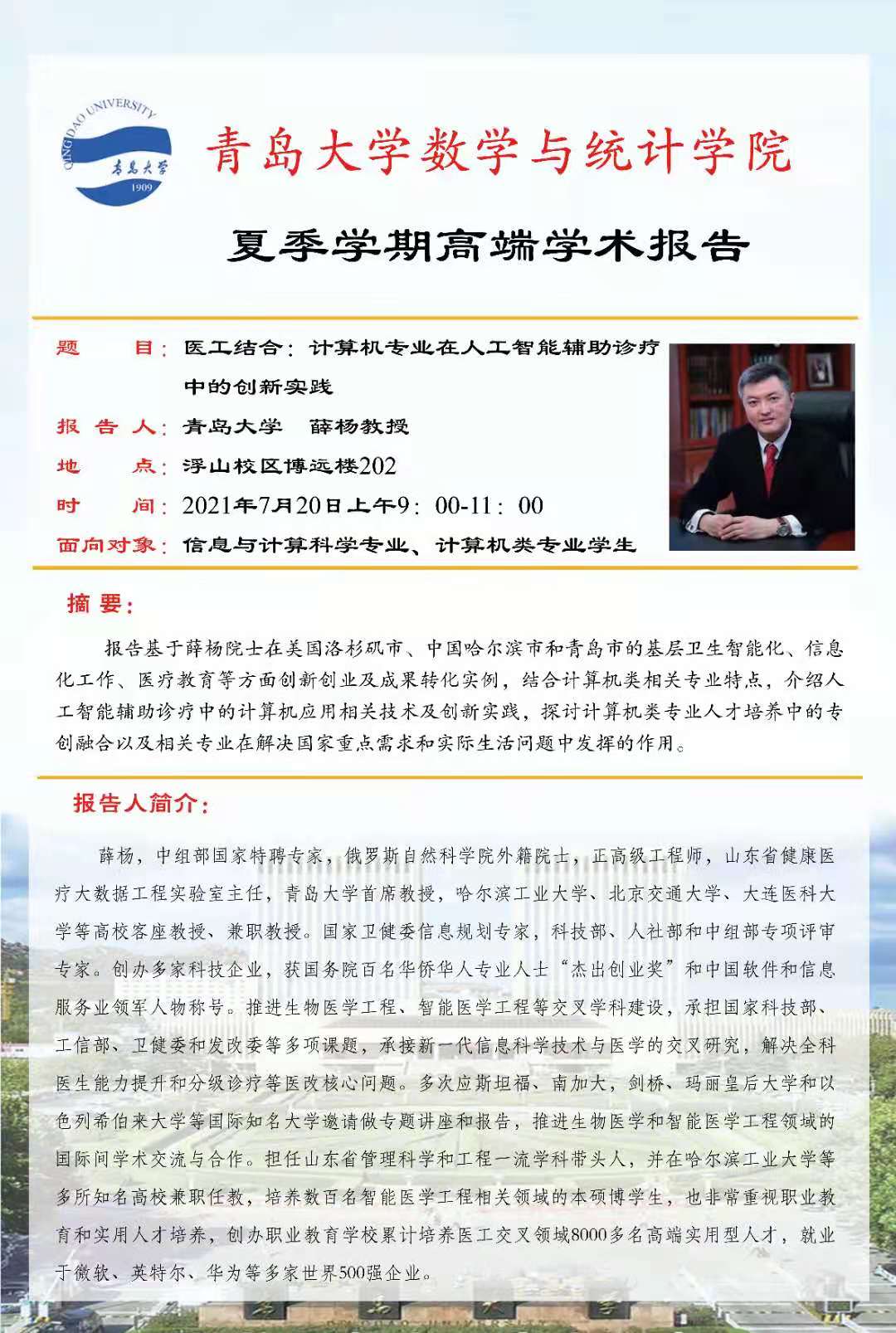 外籍院士、青岛大学健康医疗大数据研究中心主任薛杨教授作了“医工结合:计算机专业在人工智能辅助诊疗中的创新实践”的创新创业类高端学术报告,尊龙凯时国际娱乐