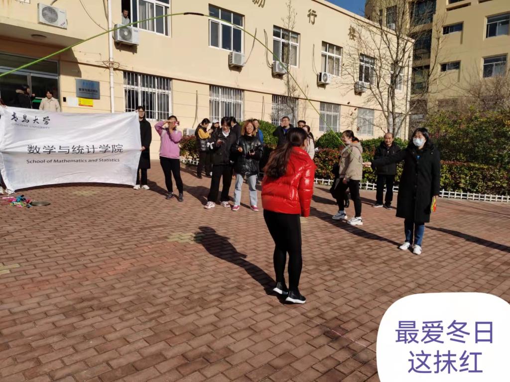 五个系一个机关共六个工会小组近90人参与了两项比赛。现场参与热情高涨,气氛热烈欢快。拔河比赛以男教工为主,大家齐心协力真正拧成一股绳,势均力敌僵持不下,初赛决出三组获胜者,经过更加激烈的角逐,最终统计学系荣获冠军,机关荣获亚军,信息与计算科学系荣获季军。跳绳比赛则更加妙趣横生。各自工会小组男教工和女教工轮番上场,三分钟计数。大家抢时间拼体力,腿软不下场,女教工娴熟多姿,男教工身轻如燕。拉拉队助威加油,现场一片热闹欢笑。最终数学系以193个荣获冠军,机关以190个荣获亚军,统计系以174个获得季军。
