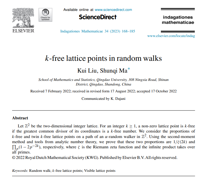 [1] Kui Liu, Shunqi Ma, K-free lattice points in random walk. Indagationes Mathematicae(2023), 34(1): 168-185.